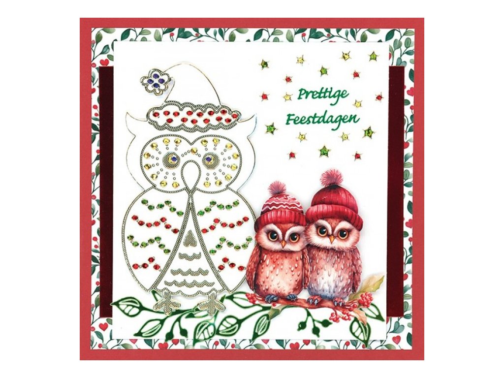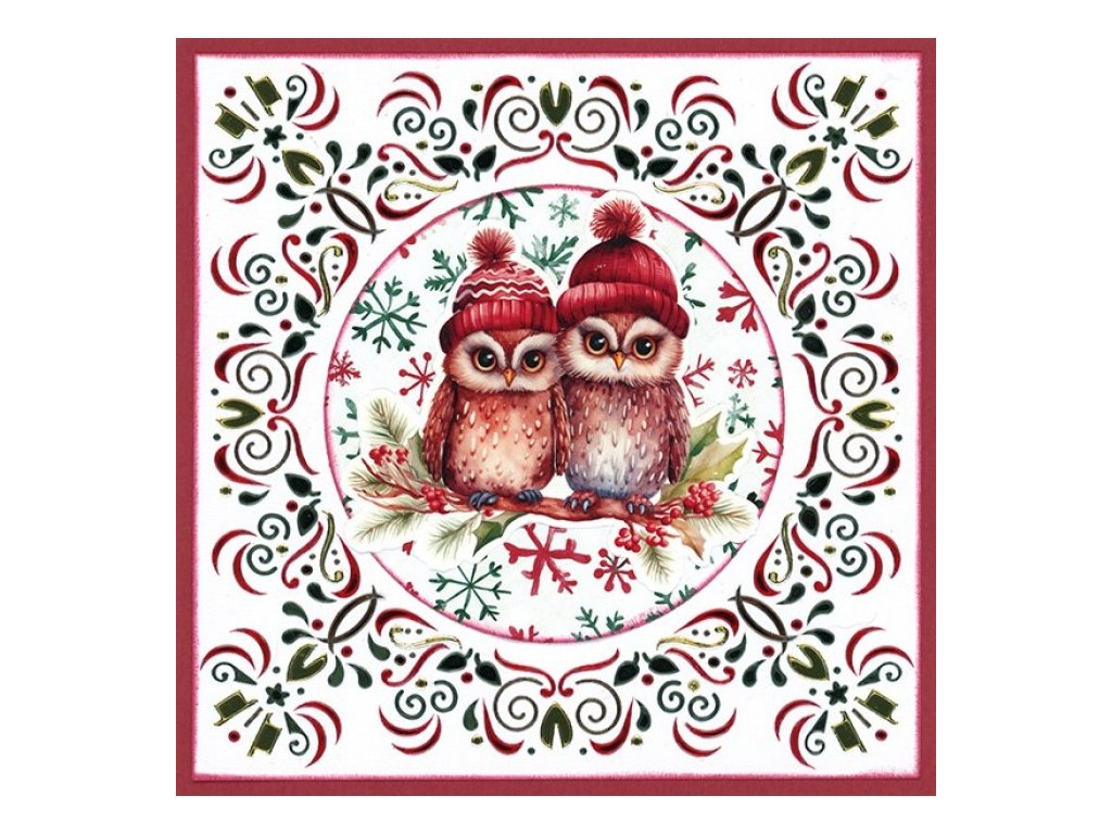 Vyřezávaný list se třemi 3D obrázky sovičky o Vánocích