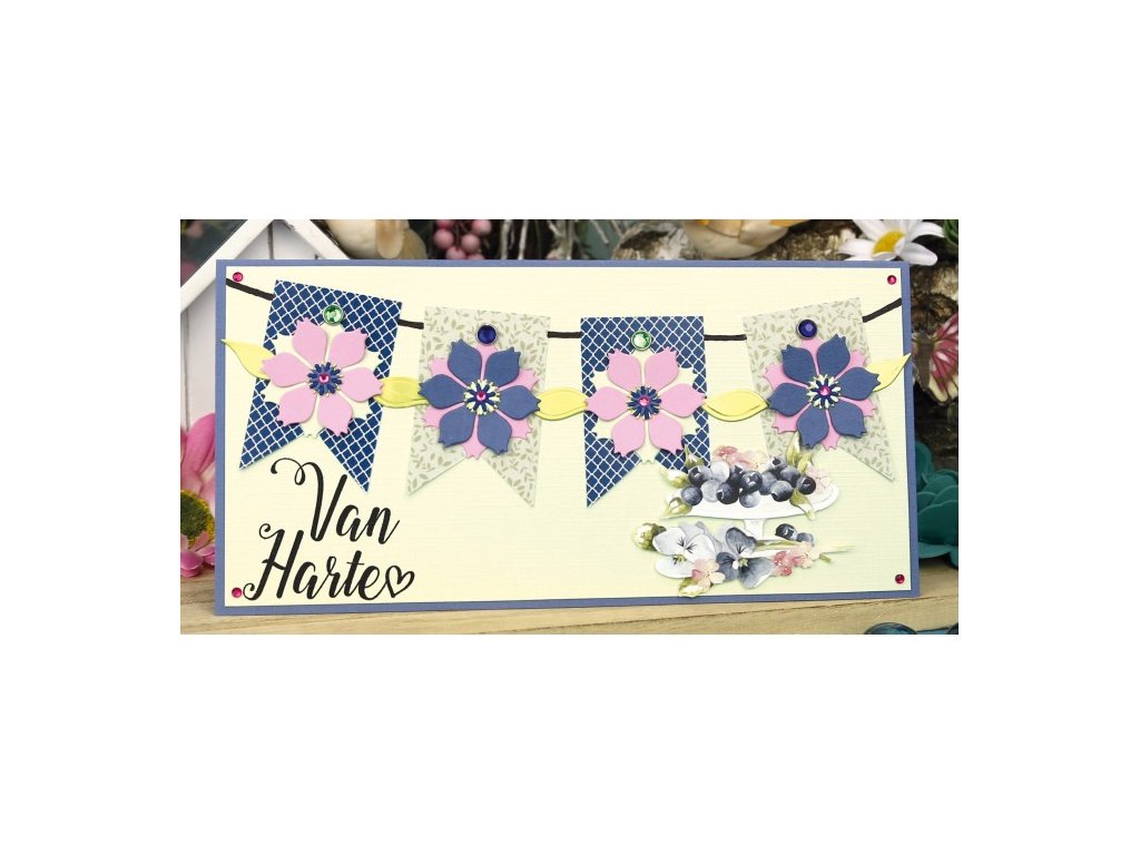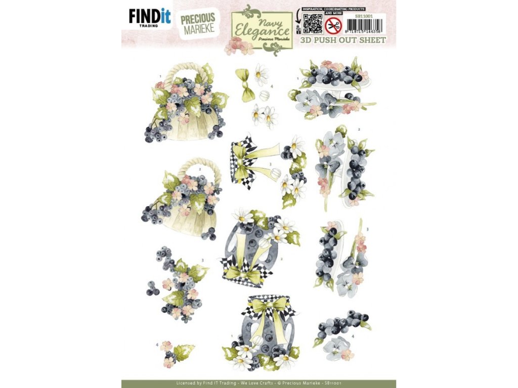 Vyřezávaný list se třemi 3D obrázky s motivem kolekce Navy Elegance od Precious Marieke.
