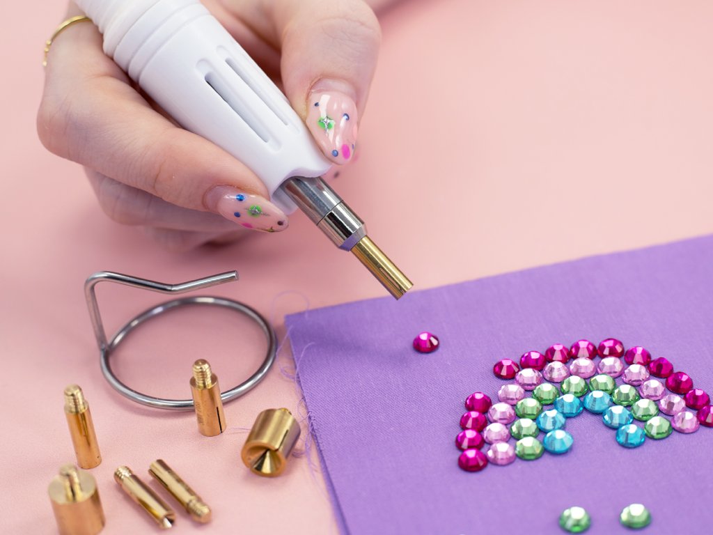 - Stačí si vybrat speciální hrot, který odpovídá velikosti vámi vybraných drahokamů, držet nástroj nad drahokamy po dobu 15–25 sekund v závislosti na velikosti a tvaru (u větších/silnějších drahokamů je třeba nástroj držet déle, aby se zajistilo pevné spojení) a nechat zaschnout.