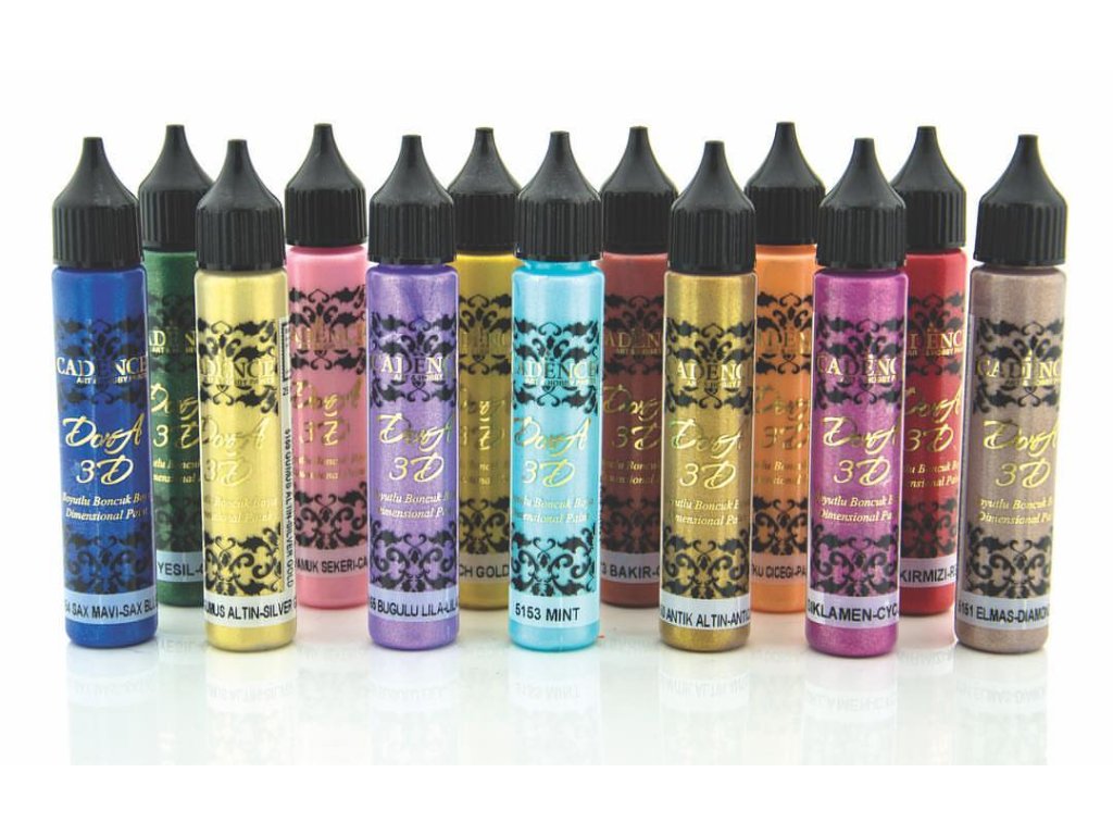 3D barva, balená v praktické konturovací lahvičce umožňuje dekorování rozmanitých povrchů: dřevo, stěny, malířské plátno, keramika, papír, textil, polystyren, kámen, beton, kov.