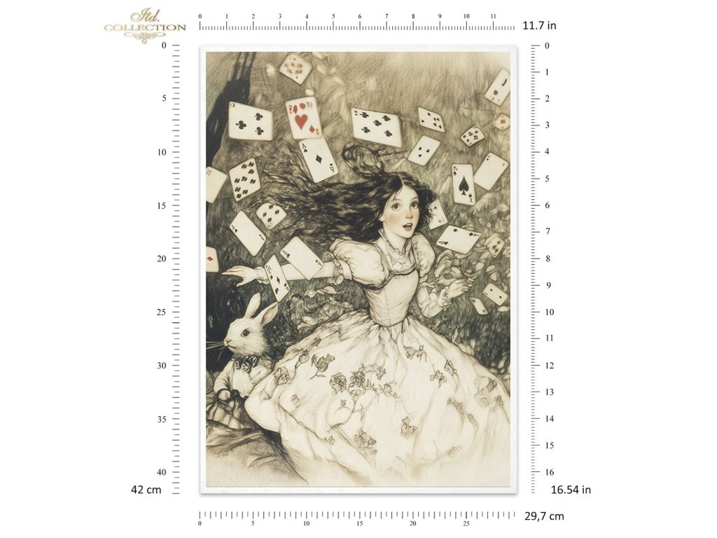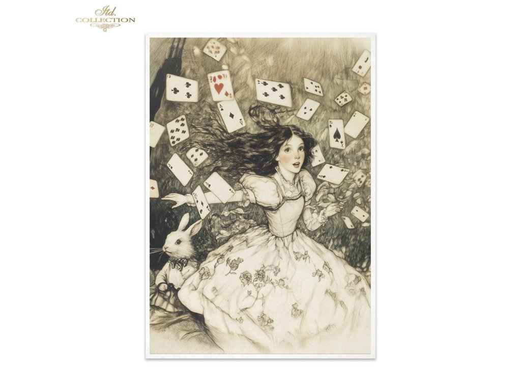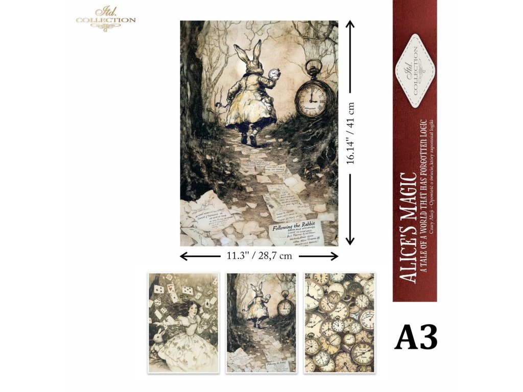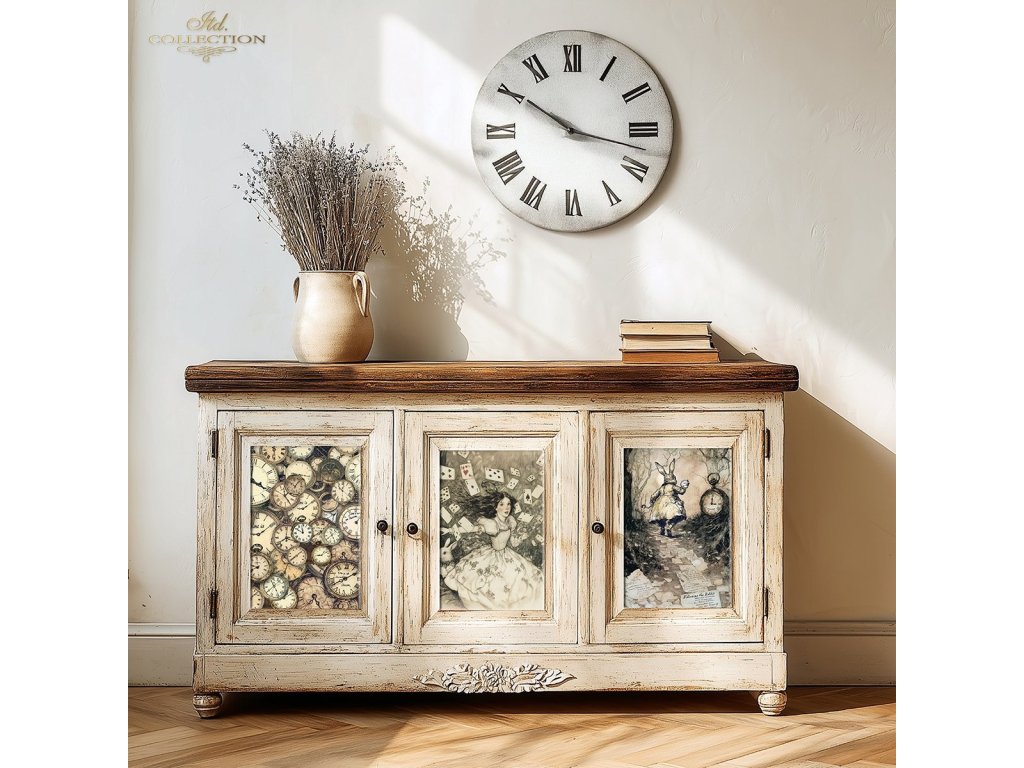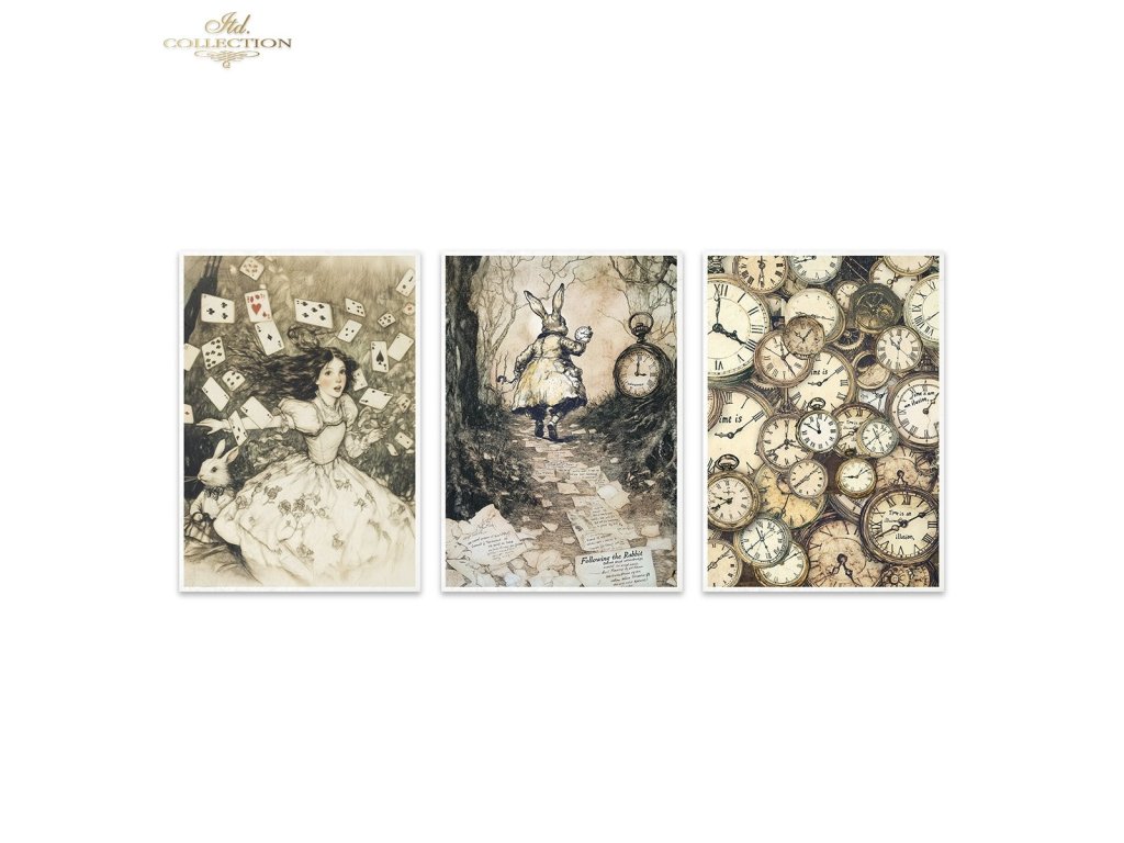 Série Alice's Magic - Bílý králík, karty, hodiny, rozházené karty s citáty.