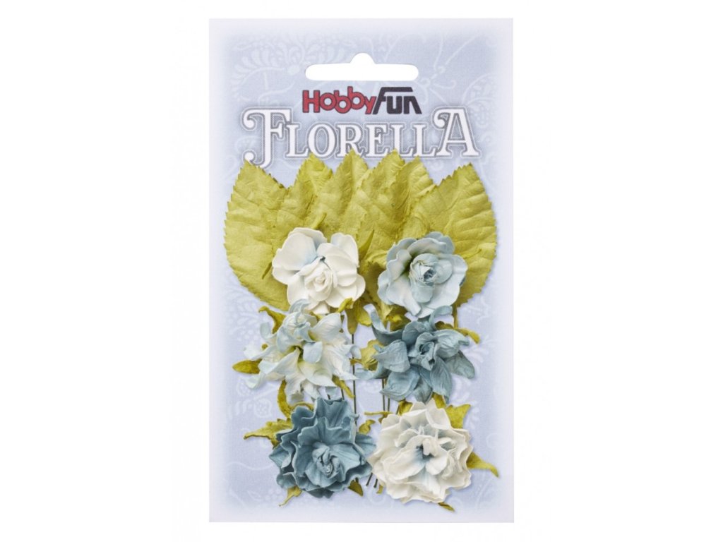 Papírové květiny FLORELLA květy a listy světle modrá 3 cm