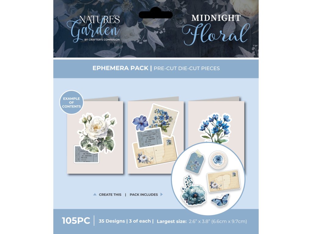 Tato sada, která je součástí kolekce Nature’s Garden Midnight Floral od Crafter’s Companion, obsahuje 105 samostatných dekorací, které mají ideální velikost pro ozdobení stránek scrapbooků, ručně vyráběných přáníček, dekorací na akce a dalších výrobků. 35 vzorů zahrnuje motýly a venkovské růže spolu s vintage pohlednicemi a štítky v jemných odstínech modré a krémové barvy. Každý vzor je k dispozici ve třech kusech, takže jich je dostatek pro každý výrobek.