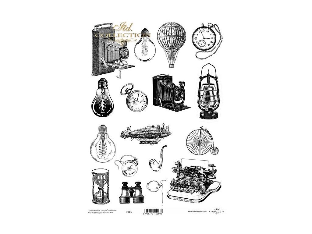 Psací stroj, jízdní kolo, fotoaparáty, žárovky, balón, Zeppelin, hodinky, dýmka, petrolejová lampa, přesýpací hodiny