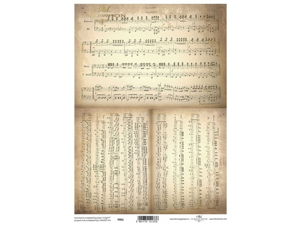 průsvitné papíry pro scrapbooking - staré hudební partitury, celá nota, půl nota, čtvrťová nota, staré noty, hudba, retro a vintage styl