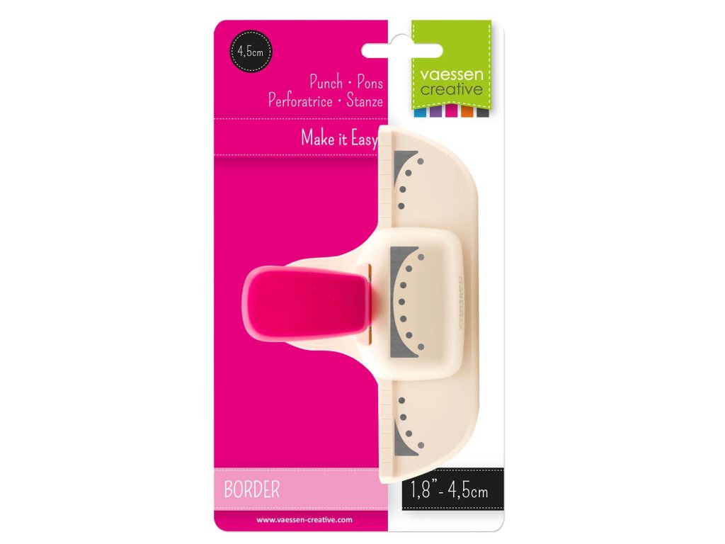 S touto děrovačkou od Vaessen Creative můžete snadno vyrazit* ozdobný okraj s půlkruhy do papíru, fotografií, korku, tenké pěny a dalších materiálů. Děrovačky jsou ideální pro zdobení okrajů karet, stránek scrapbooků, diářů, štítků a pozvánek. Použití děrovačky je jednoduché a uživatelsky přívětivé. Jednoduše vložte materiál do děrovačky a stiskněte. Poté zarovnejte děrovačku s již vyříznutým ozdobným okrajem, aby vzor pěkně seděl. Tento postup opakujte, dokud není okraj hotový. Během několika sekund získáte krásný detailní vzor na svém papírovém projektu.