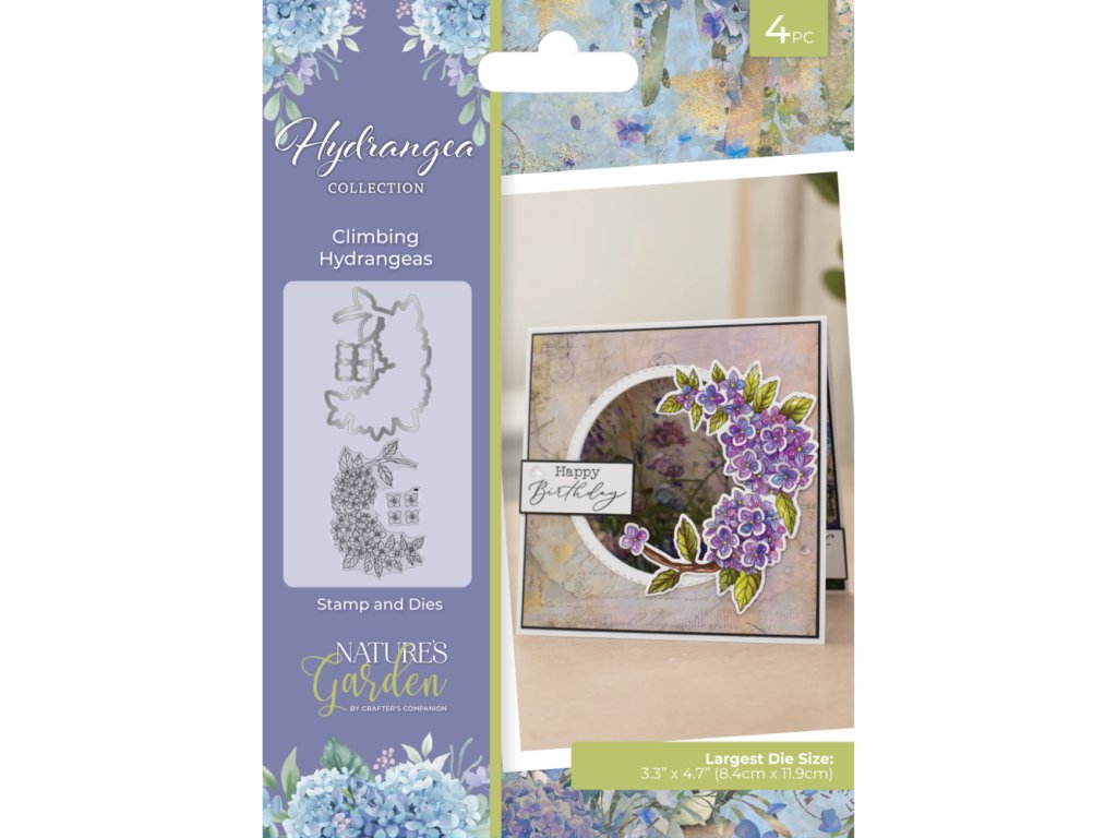 - Sada pro horolezecké hortenzie Nature's Garden obsahuje dvě kovové raznice a dvě razítka k vytvoření větve rozkvetlých květů hortenzie, jemně zakřivené, aby seděla kolem otvorů nebo rámovala sladké pocity.