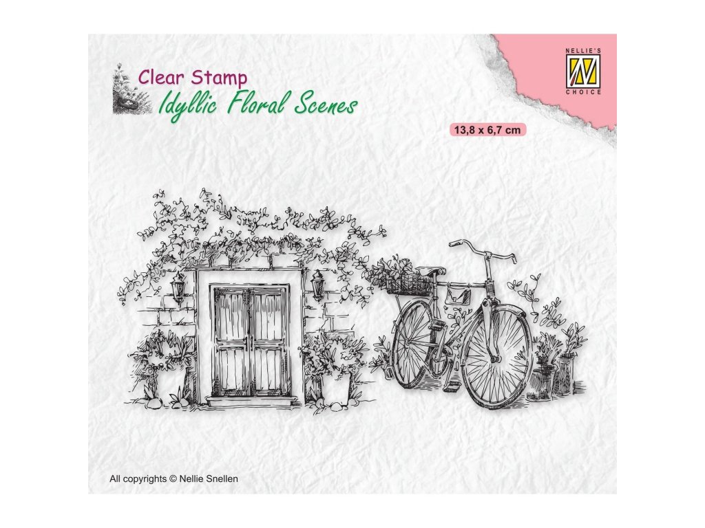 Razítka Nellie's Choice Idyllic Floral Scenes Old Door with Bike Stará brána s kolem
