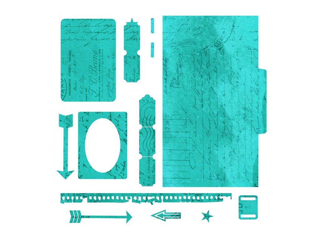 - Sada obsahuje 13 tenkých kovových razítek, z nichž největší má rozměry přibližně 10,8 x 17,5 cm.