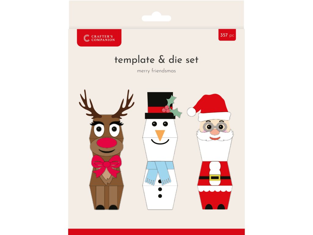 Oživte své vánoční tvoření sadou kovových výseků a šablon Merry Friendsmas a vytvořte tyto 3D krabičky. Pomocí šablony a přiložených gumiček si můžete vyrobit vlastního soba Rudolfa, Santu a veselého sněhuláka, kteří mohou být perfektním vánočním dárkem nebo ozdobou vánočního stolu. Vyřezávání dává vyřezávaným vzorům jemnost, kterou nelze dosáhnout nůžkami nebo řezacím nožem, což znamená, že můžete přesně vyřezat prvky pro Rudolfa, Santu a veselého sněhuláka.