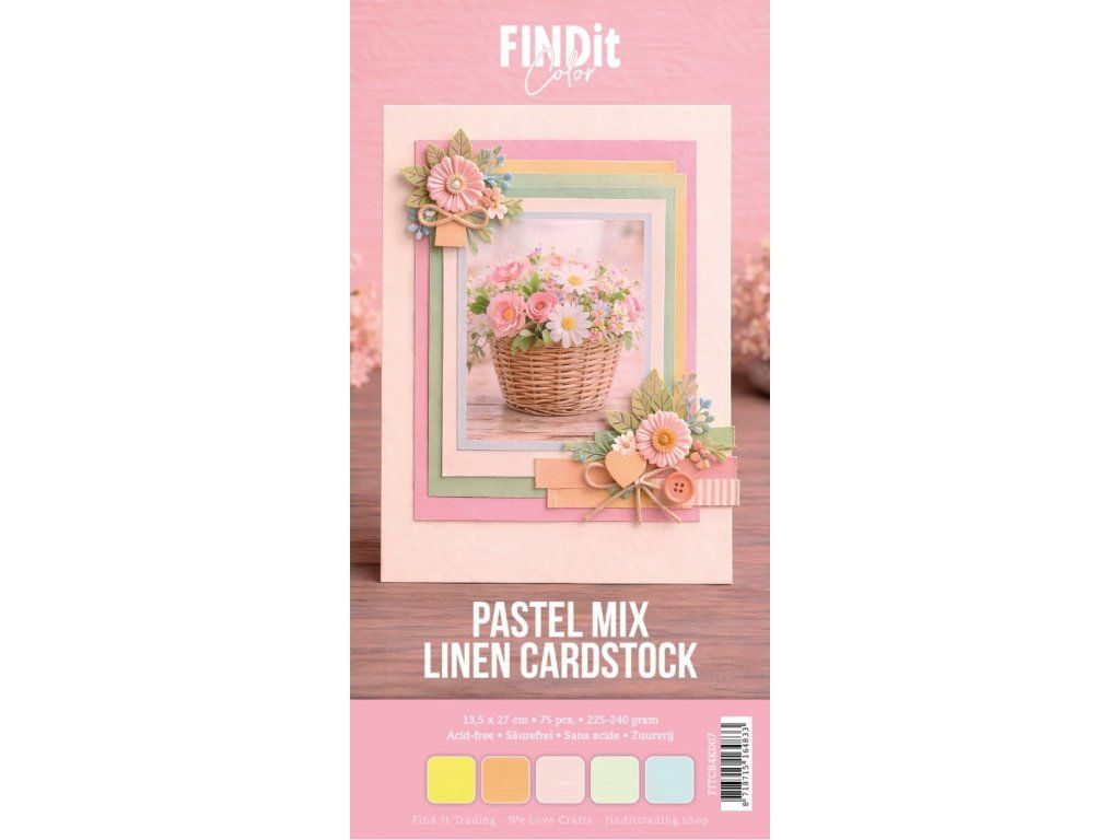 - Balíček obsahuje 75 listů lněného kartonu o gramáži 225–240 g/m² v pěti pastelových odstínech