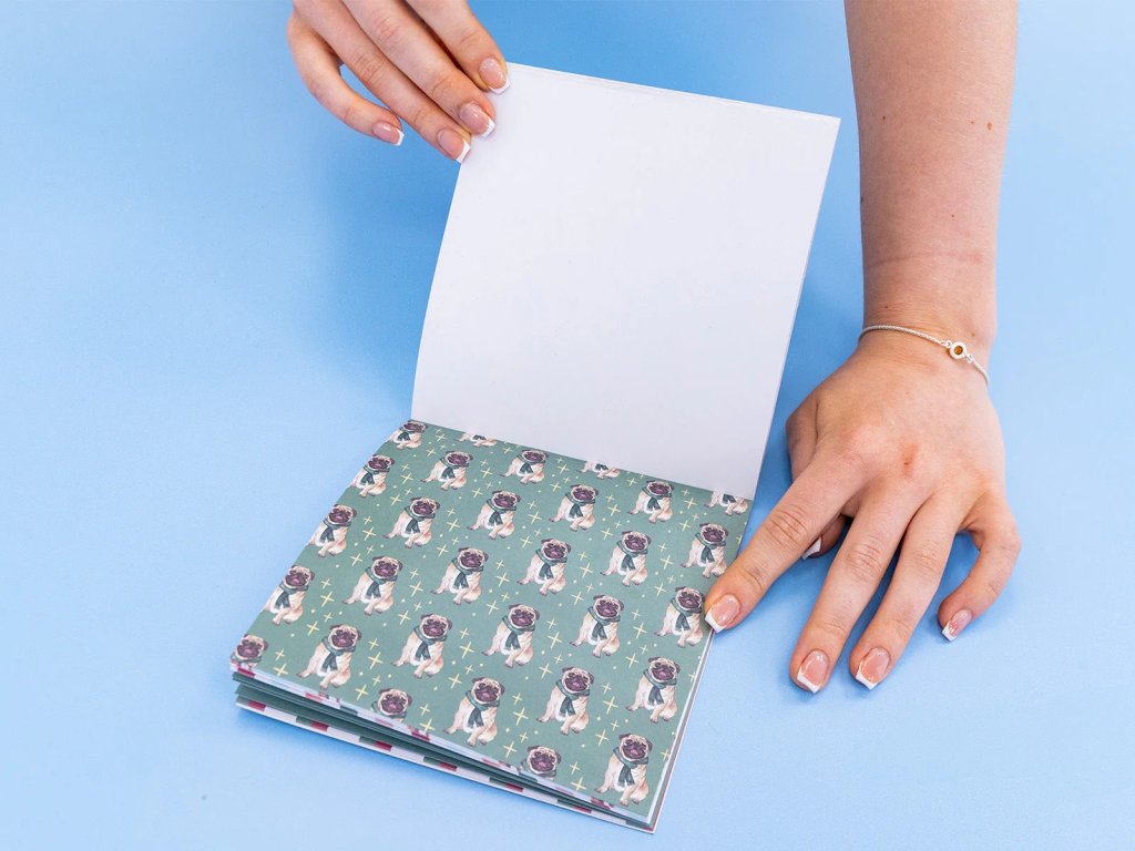 - Každý blok obsahuje 36 oboustranných listů v jasných odstínech růžové, modré, červené a zelené barvy s motivy psů oblečených do zimního oblečení, dárků, třpytek a vánočních stromků.