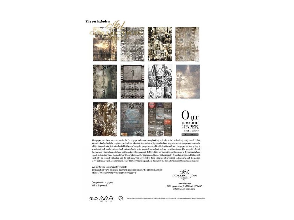 Sada obsahuje: - 11 rýžových papírů 30-35 g/m² s grafikou - formát A4 (A4 - 210x297 mm / 8,27x11,7 palce ; gramáž papíru 30-35 g/m²)