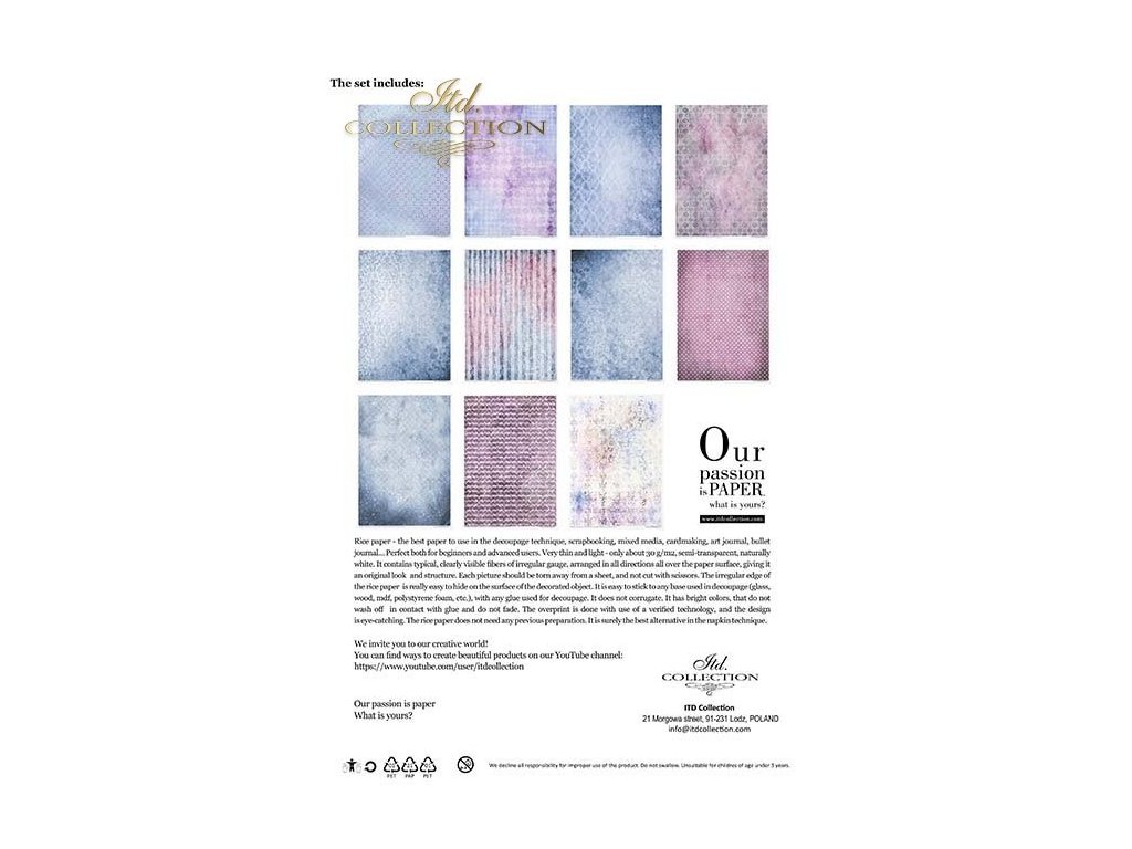 Sada obsahuje: - 11 rýžových papírů 30-35 g/m² s grafikou - formát A4 (A4 - 210x297 mm / 8,27x11,7 palce ; gramáž papíru 30-35 g/m²)