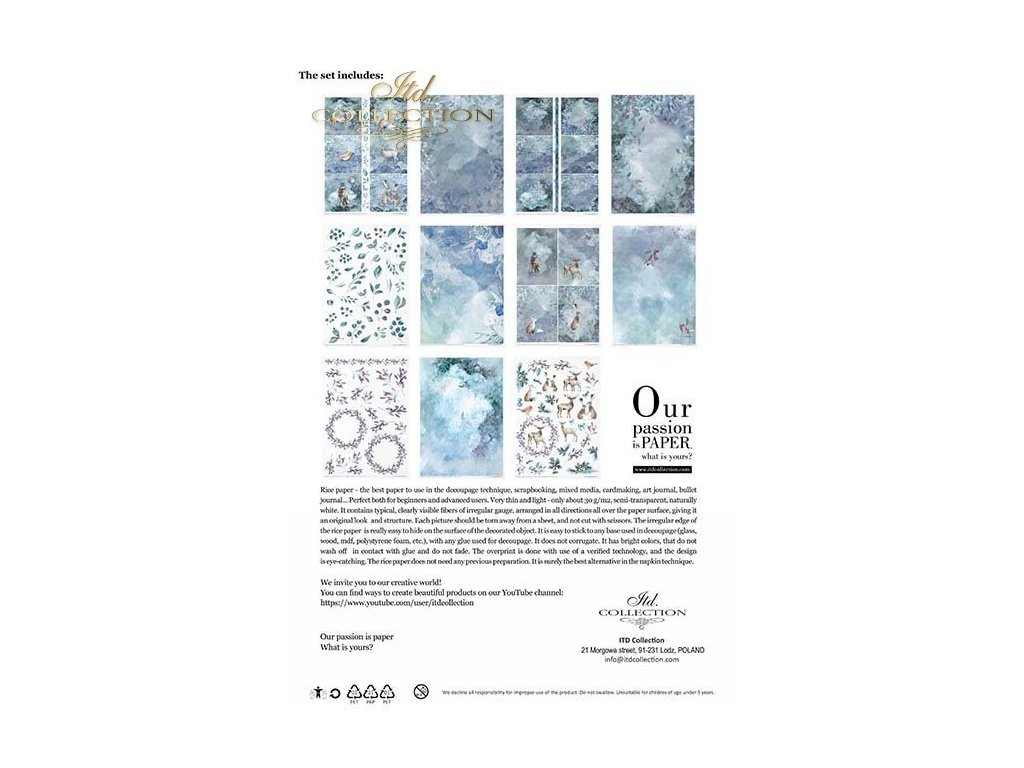 Sada obsahuje: - 11 rýžových papírů 30-35 g/m² s grafikou - formát A4 (A4 - 210x297 mm / 8,27x11,7 palce ; gramáž papíru 30-35 g/m²)