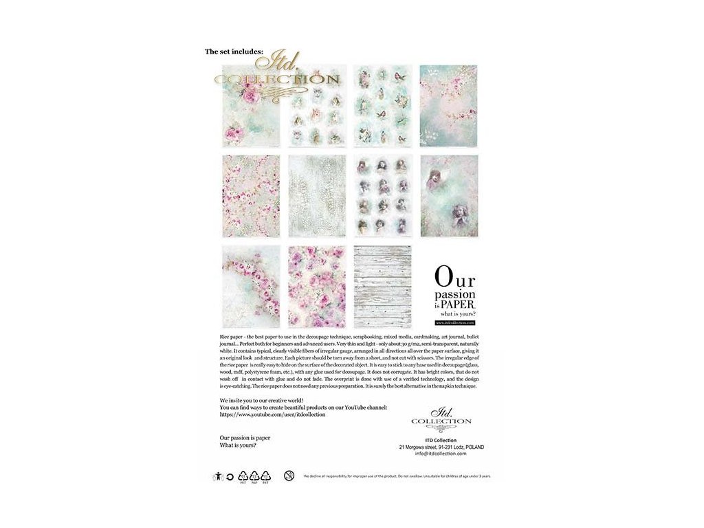 Sada obsahuje: - 11 rýžových papírů 30-35 g/m² s grafikou - formát A4 (A4 - 210x297 mm / 8,27x11,7 palce ; gramáž papíru 30-35 g/m²)