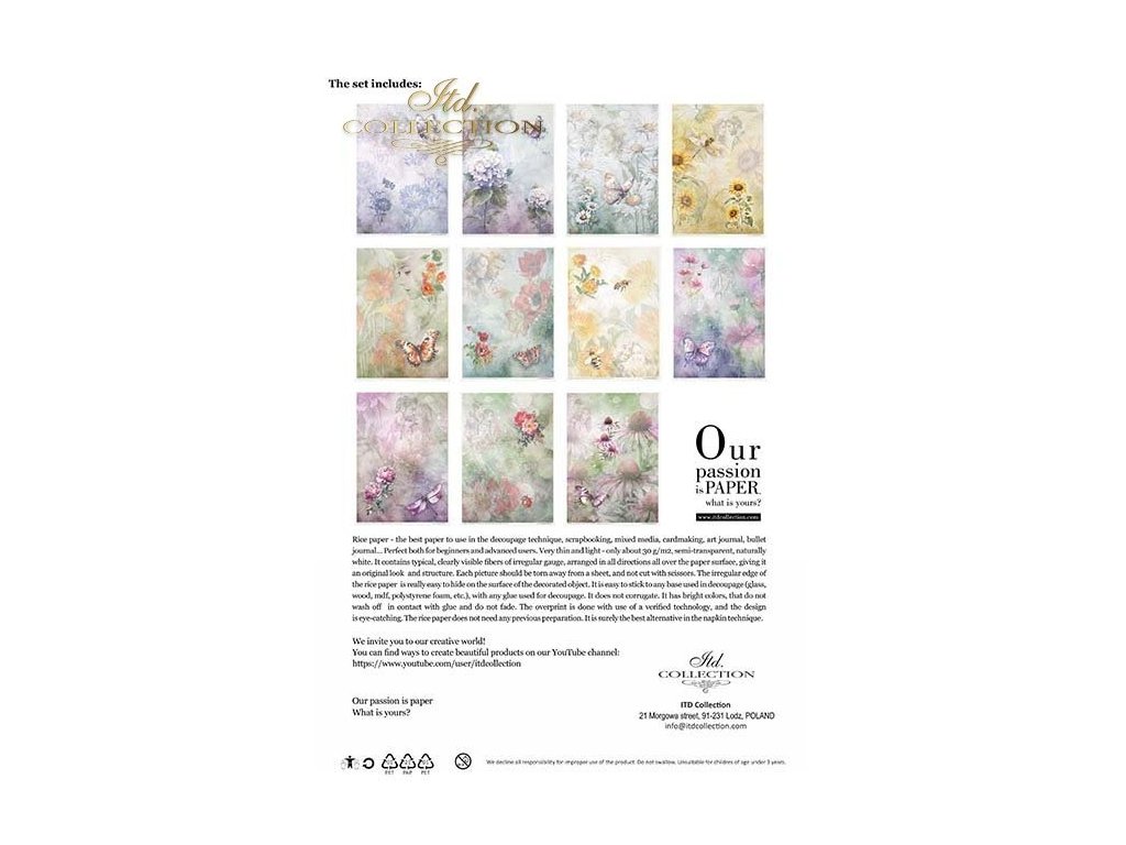 Sada obsahuje: - 11 rýžových papírů 30-35 g/m² s grafikou - formát A4 (A4 - 210x297 mm / 8,27x11,7 palce ; gramáž papíru 30-35 g/m²)