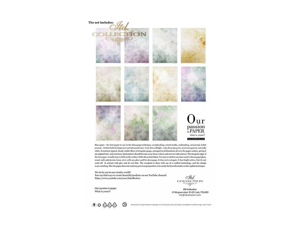 Sada obsahuje: - 11 rýžových papírů 30-35 g/m² s grafikou - formát A4 (A4 - 210x297 mm / 8,27x11,7 palce ; gramáž papíru 30-35 g/m²)