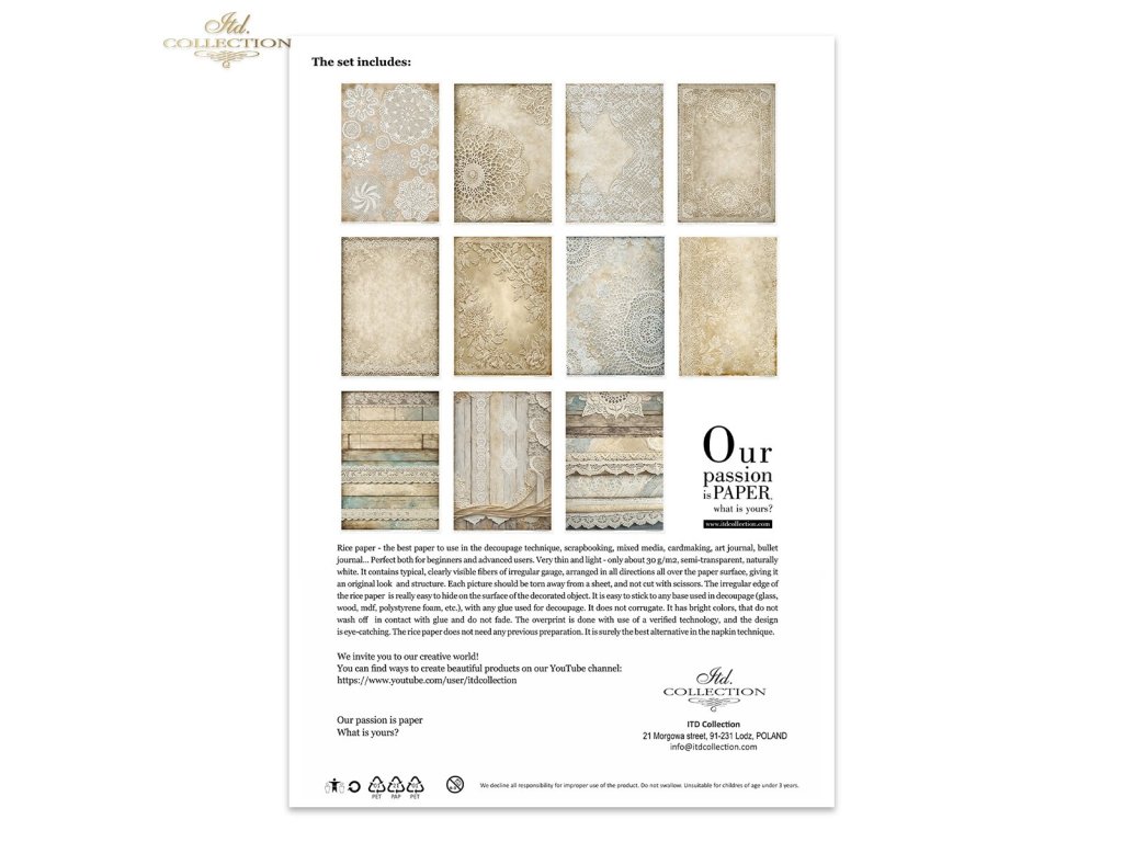 Sada obsahuje: - 11 rýžových papírů 30-35 g/m² s grafikou - formát A4 (A4 - 210x297 mm / 8,27x11,7 palce ; gramáž papíru 30-35 g/m²)