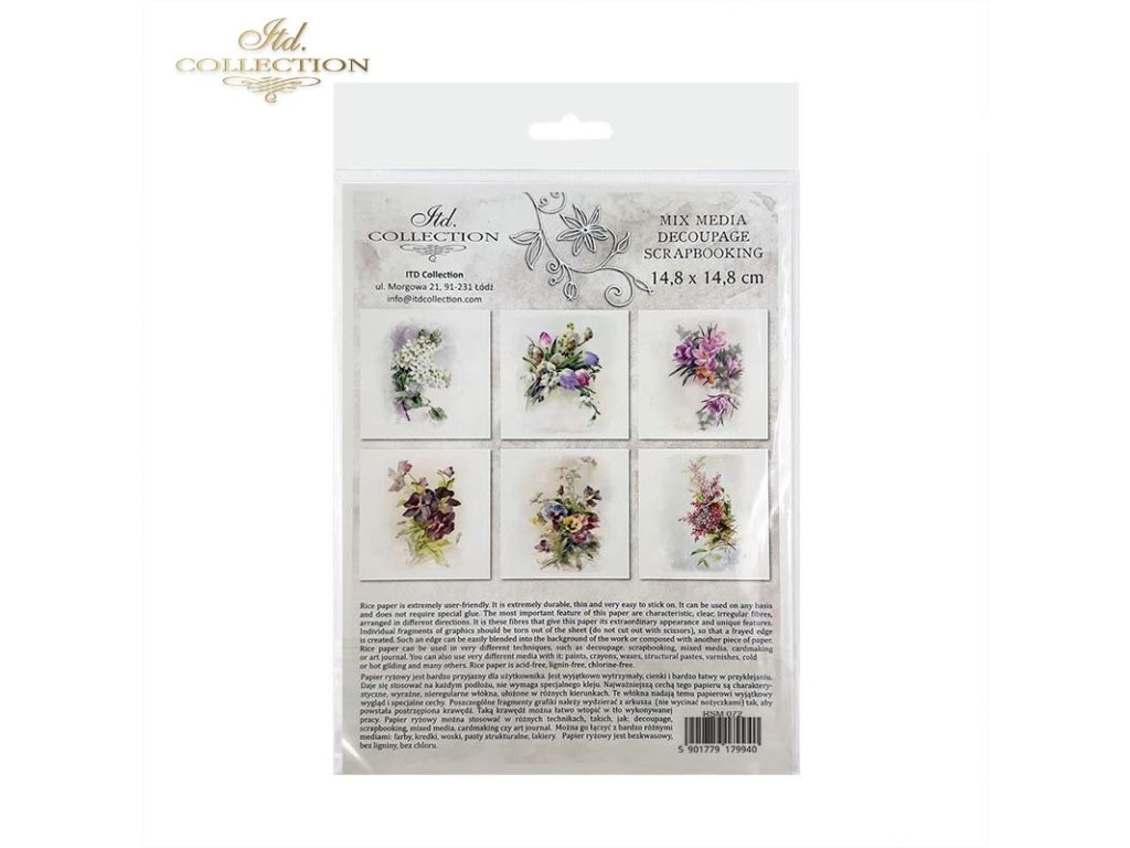 Sada papírů RSM obsahuje: 6 listů rýžového papíru 14,8x14,8 cm / 5,8''x5,8'' s jednotlivými grafikami - 6 různých vzorů v jednom balení.