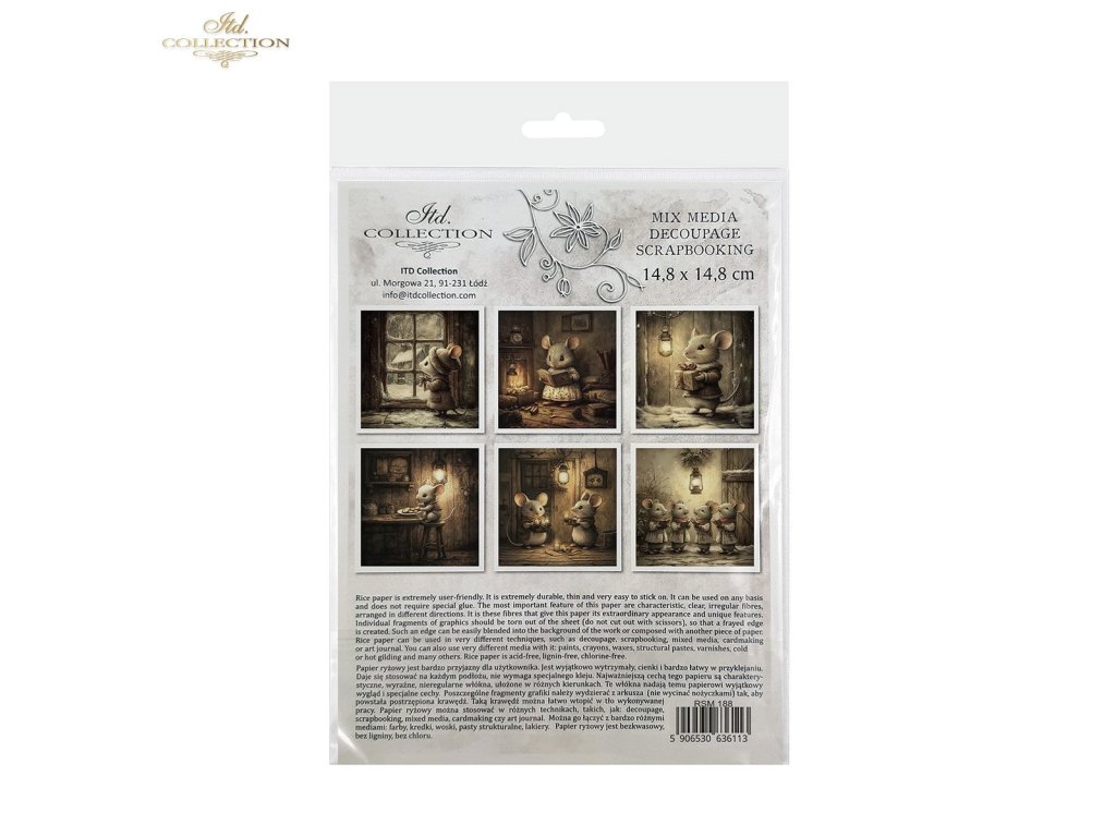 Sada mimořádných rýžových papírů, které lze využít v jakékoli kreativní práci, jako je decoupage, scrapbooking, kombinovaná média, výroba přání a umělecký deník. Sada obsahuje 6 barevných vzorů, které jsou shromážděny v jednom tématickém poli a nejsou k dispozici mimo sadu. Každý list představuje pouze jeden design, což usnadňuje jeho začlenění do již plánované práce. Grafiky jsou velmi užitečné jako hlavní ornamentální téma, které lze začlenit na malé a středně velké předměty, jako jsou hrnky, svíčky, krabičky, krabičky na kapesníky, podšálky, vajíčka, vánoční ozdoby. Všechny grafiky v sadě k sobě ladí barvami a vzory – jsou vhodné při tvorbě předmětů ze sady. Na zadní straně sady najdete miniverze všech grafik, které jsou v sadě. Každý obrázek je umístěn na světlém, nepravidelném pozadí, které je univerzální. Snadno je lze implementovat s jinými grafikami nebo na jakékoli jiné pozadí. Přesvědčte se sami! Přejeme vám skvělou zábavu!