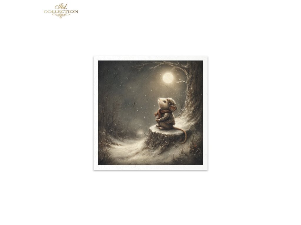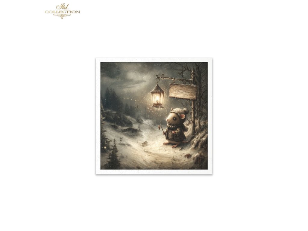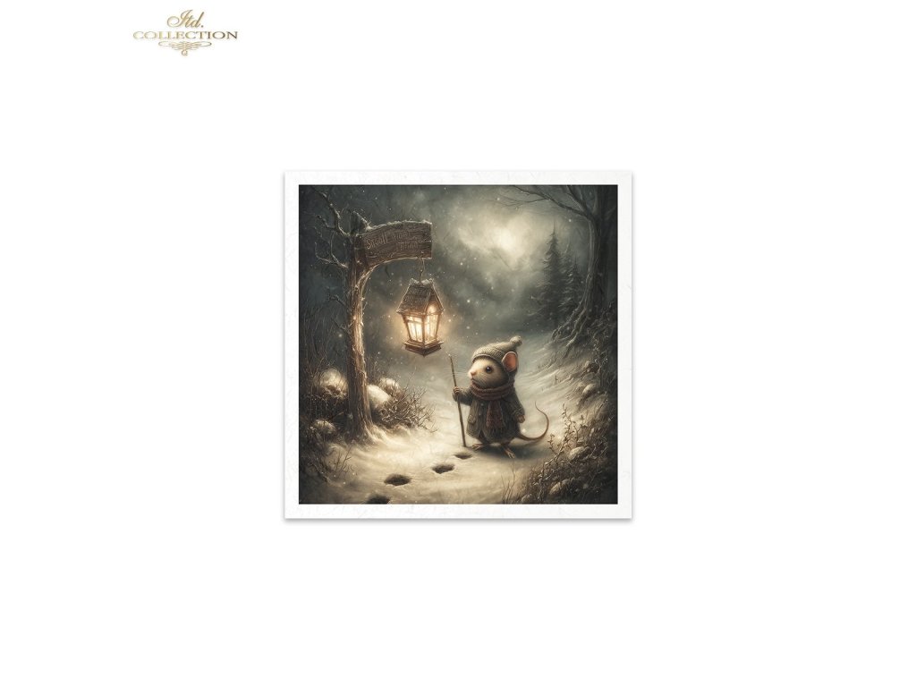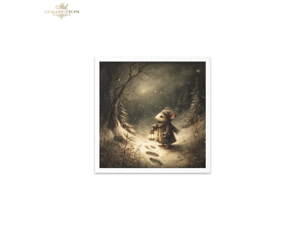 vintage papír se zimním motivem, lesní zvířátka, myška, myši, zima, sníh, les, ilustrace, antropomorfní, pohádka, teplé oblečení, lucerna, lucerny, noc, tma, měsíc, pohádkový les, zimní krajina, cesta, hledání, atmosféra, útulné, okouzlující, detaily, zasněžené stromy, zvířata, postavy