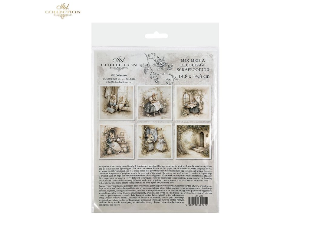 Sada mimořádných rýžových papírů, které lze využít v jakékoli kreativní práci, jako je decoupage, scrapbooking, kombinovaná média, výroba přání a umělecký deník. Sada obsahuje 6 barevných vzorů, které jsou shromážděny v jednom tématickém poli a nejsou k dispozici mimo sadu. Každý list představuje pouze jeden design, což usnadňuje jeho začlenění do již plánované práce. Grafiky jsou velmi užitečné jako hlavní ornamentální téma, které lze začlenit na malé a středně velké předměty, jako jsou hrnky, svíčky, krabičky, krabičky na kapesníky, podšálky, vajíčka, vánoční ozdoby. Všechny grafiky v sadě k sobě ladí barvami a vzory – jsou vhodné při tvorbě předmětů ze sady. Na zadní straně sady najdete miniverze všech grafik, které jsou v sadě. Každý obrázek je umístěn na světlém, nepravidelném pozadí, které je univerzální. Snadno je lze implementovat s jinými grafikami nebo na jakékoli jiné pozadí. Přesvědčte se sami! Přejeme vám skvělou zábavu!