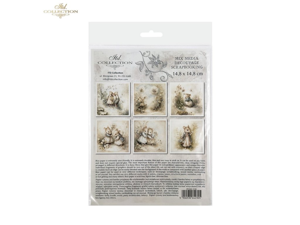Sada mimořádných rýžových papírů, které lze využít v jakékoli kreativní práci, jako je decoupage, scrapbooking, kombinovaná média, výroba přání a umělecký deník. Sada obsahuje 6 barevných vzorů, které jsou shromážděny v jednom tématickém poli a nejsou k dispozici mimo sadu. Každý list představuje pouze jeden design, což usnadňuje jeho začlenění do již plánované práce. Grafiky jsou velmi užitečné jako hlavní ornamentální téma, které lze začlenit na malé a středně velké předměty, jako jsou hrnky, svíčky, krabičky, krabičky na kapesníky, podšálky, vajíčka, vánoční ozdoby. Všechny grafiky v sadě k sobě ladí barvami a vzory – jsou vhodné při tvorbě předmětů ze sady. Na zadní straně sady najdete miniverze všech grafik, které jsou v sadě. Každý obrázek je umístěn na světlém, nepravidelném pozadí, které je univerzální. Snadno je lze implementovat s jinými grafikami nebo na jakékoli jiné pozadí. Přesvědčte se sami! Přejeme vám skvělou zábavu!