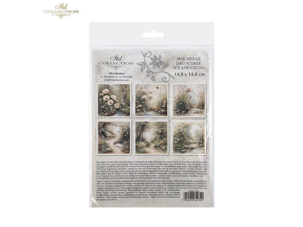 Sada papírů RSM obsahuje: 6 listů rýžového papíru 14,8x14,8 cm / 5,8''x5,8'' s jednotlivými grafikami - 6 různých vzorů v jednom balení.