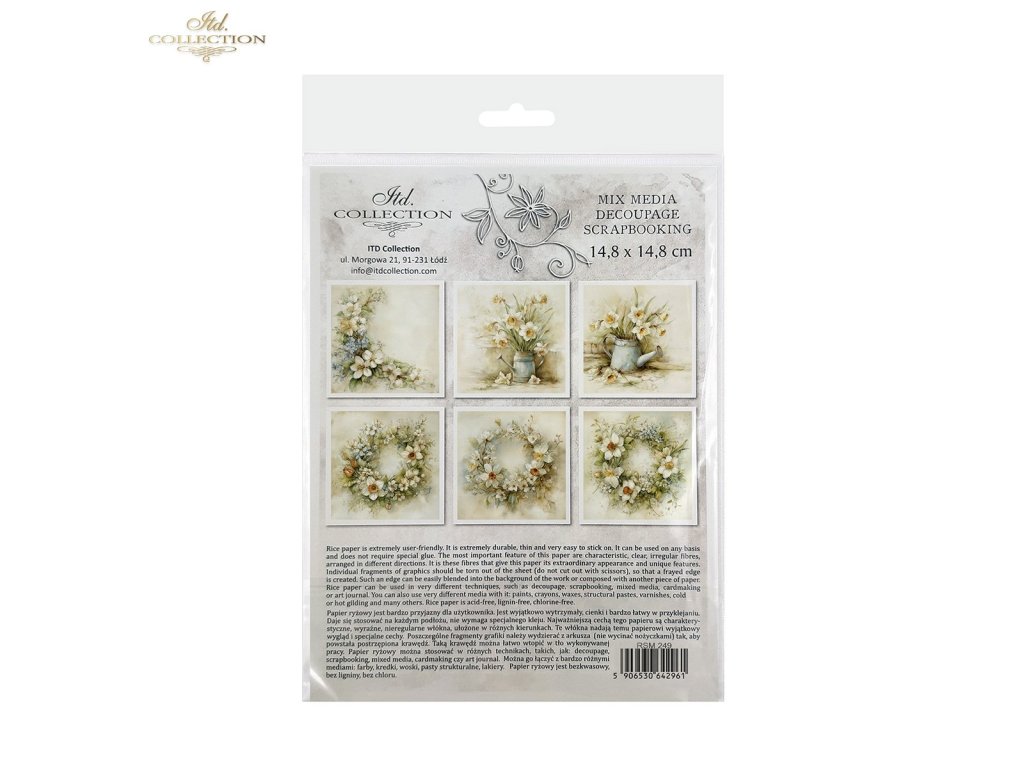 Sada mimořádných rýžových papírů, které lze využít v jakékoli kreativní práci, jako je decoupage, scrapbooking, kombinovaná média, výroba přání a umělecký deník. Sada obsahuje 6 barevných vzorů, které jsou shromážděny v jednom tématickém poli a nejsou k dispozici mimo sadu. Každý list představuje pouze jeden design, což usnadňuje jeho začlenění do již plánované práce. Grafiky jsou velmi užitečné jako hlavní ornamentální téma, které lze začlenit na malé a středně velké předměty, jako jsou hrnky, svíčky, krabičky, krabičky na kapesníky, podšálky, vajíčka, vánoční ozdoby. Všechny grafiky v sadě k sobě ladí barvami a vzory – jsou vhodné při tvorbě předmětů ze sady. Na zadní straně sady najdete miniverze všech grafik, které jsou v sadě. Každý obrázek je umístěn na světlém, nepravidelném pozadí, které je univerzální. Snadno je lze implementovat s jinými grafikami nebo na jakékoli jiné pozadí. Přesvědčte se sami! Přejeme vám skvělou zábavu!