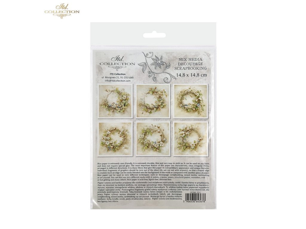 Sada mimořádných rýžových papírů, které lze využít v jakékoli kreativní práci, jako je decoupage, scrapbooking, kombinovaná média, výroba přání a umělecký deník. Sada obsahuje 6 barevných vzorů, které jsou shromážděny v jednom tématickém poli a nejsou k dispozici mimo sadu. Každý list představuje pouze jeden design, což usnadňuje jeho začlenění do již plánované práce. Grafiky jsou velmi užitečné jako hlavní ornamentální téma, které lze začlenit na malé a středně velké předměty, jako jsou hrnky, svíčky, krabičky, krabičky na kapesníky, podšálky, vajíčka, vánoční ozdoby. Všechny grafiky v sadě k sobě ladí barvami a vzory – jsou vhodné při tvorbě předmětů ze sady. Na zadní straně sady najdete miniverze všech grafik, které jsou v sadě. Každý obrázek je umístěn na světlém, nepravidelném pozadí, které je univerzální. Snadno je lze implementovat s jinými grafikami nebo na jakékoli jiné pozadí. Přesvědčte se sami! Přejeme vám skvělou zábavu!