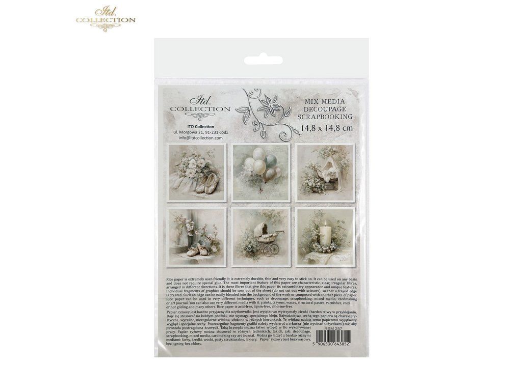 Sada papírů RSM obsahuje: 6 listů rýžového papíru 14,8x14,8 cm / 5,8''x5,8'' s jednotlivými grafikami - 6 různých vzorů v jednom balení.