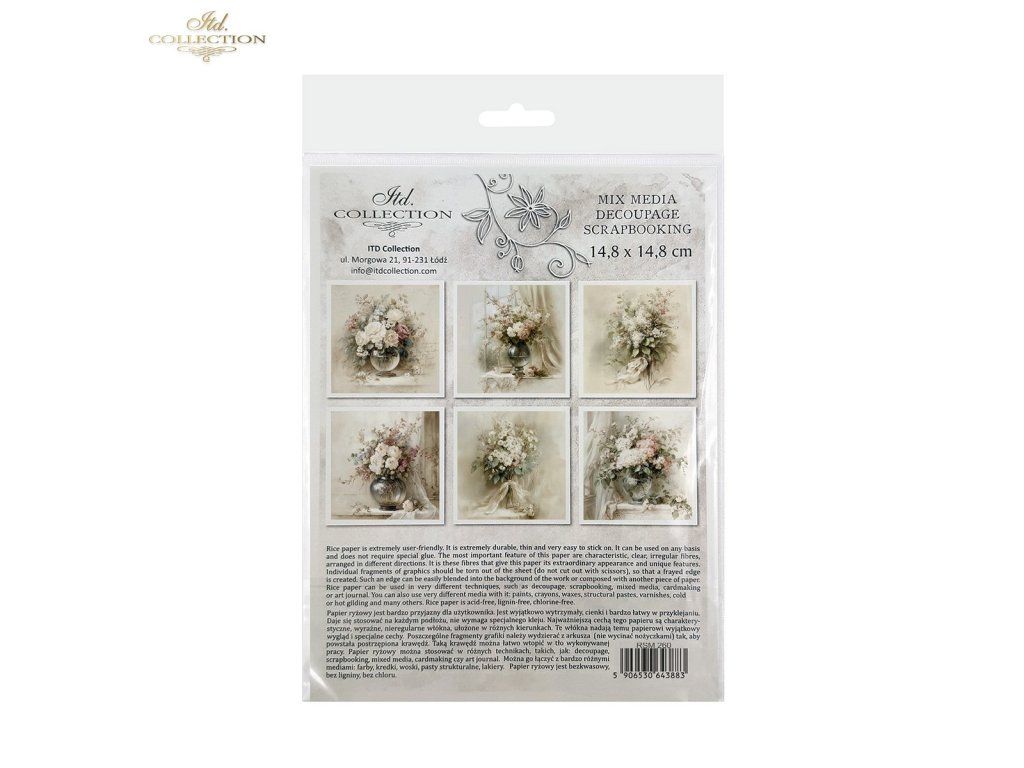 Sada mimořádných rýžových papírů, které lze využít v jakékoli kreativní práci, jako je decoupage, scrapbooking, kombinovaná média, výroba přání a umělecký deník. Sada obsahuje 6 barevných vzorů, které jsou shromážděny v jednom tématickém poli a nejsou k dispozici mimo sadu. Každý list představuje pouze jeden design, což usnadňuje jeho začlenění do již plánované práce. Grafiky jsou velmi užitečné jako hlavní ornamentální téma, které lze začlenit na malé a středně velké předměty, jako jsou hrnky, svíčky, krabičky, krabičky na kapesníky, podšálky, vajíčka, vánoční ozdoby. Všechny grafiky v sadě k sobě ladí barvami a vzory – jsou vhodné při tvorbě předmětů ze sady. Na zadní straně sady najdete miniverze všech grafik, které jsou v sadě. Každý obrázek je umístěn na světlém, nepravidelném pozadí, které je univerzální. Snadno je lze implementovat s jinými grafikami nebo na jakékoli jiné pozadí. Přesvědčte se sami! Přejeme vám skvělou zábavu!
