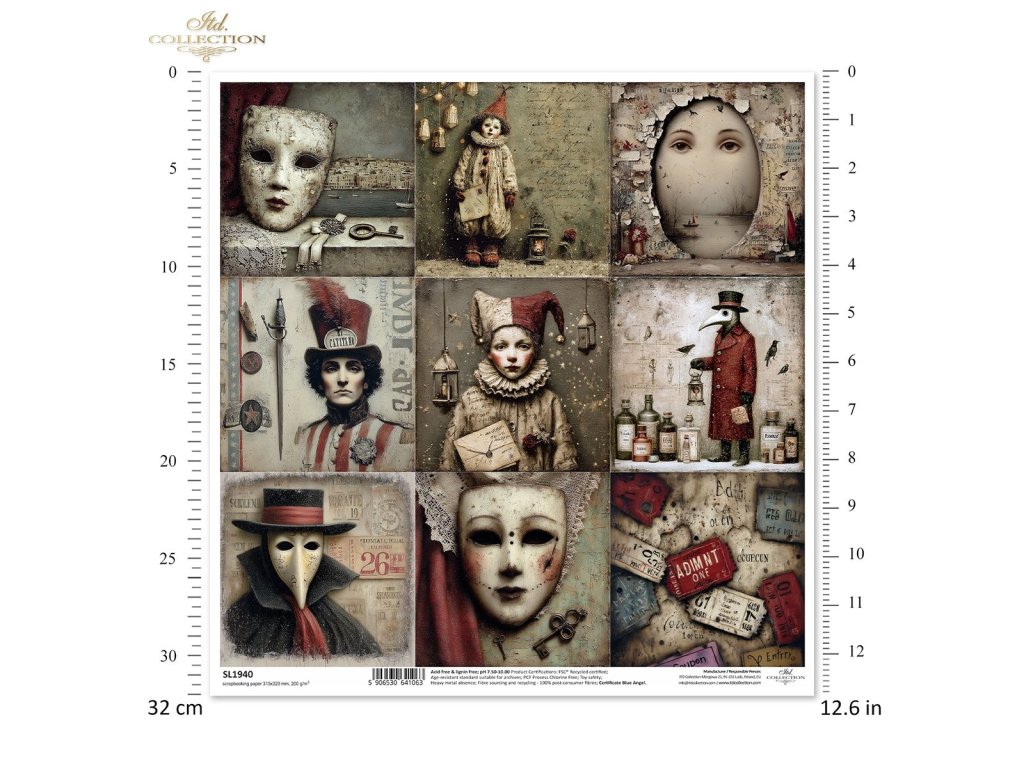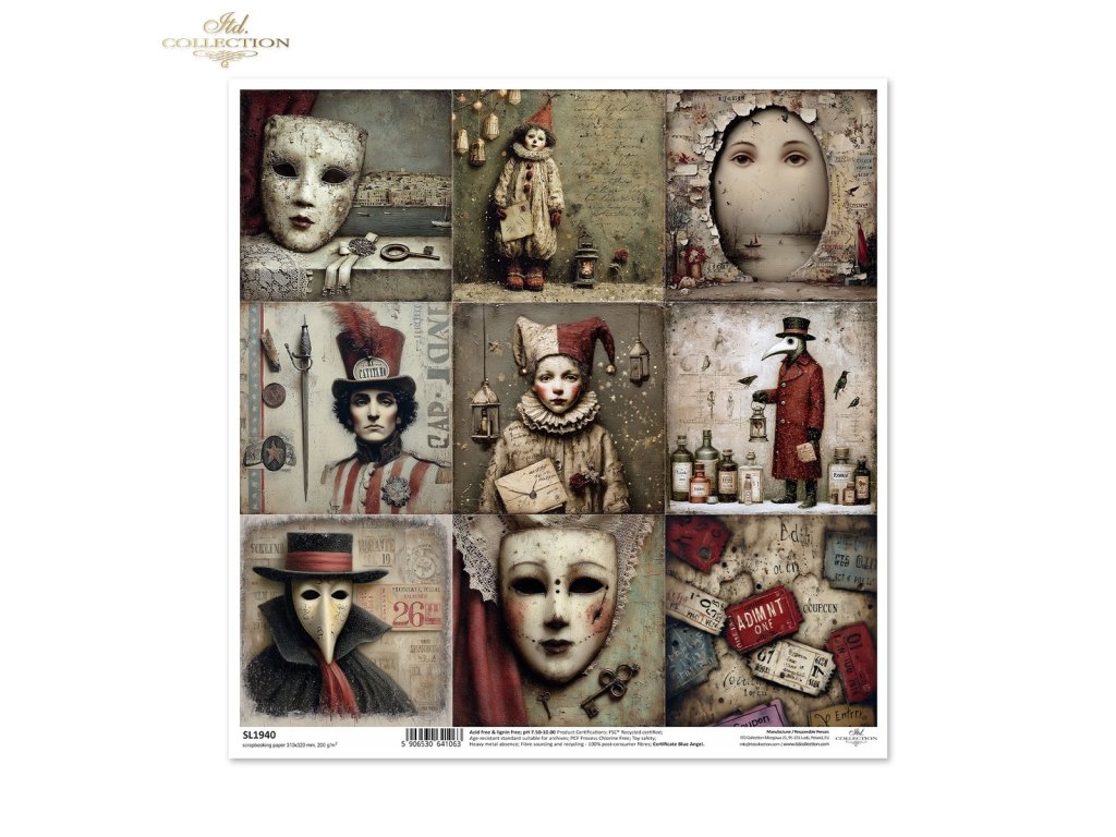 karneval, maškaráda, masky, commedia dell'arte, divadlo, vintage, retro, melancholie, tajemno, starý papír, textury, koláž, divadelní postavy, doktor, klaun, Pierrot ...