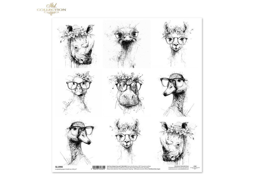 zvířata, portréty, skici, černobílé, brýle, věnce, květiny, nosorožec, pštros, alpaka, kachna, hroch, grafika, moderní...