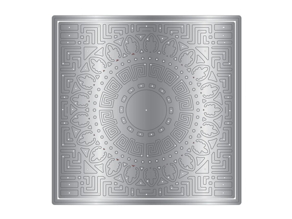- Tato sada obsahuje dvě kovové raznice na vyřezávání složitého a zdobného vzoru dlaždic v rámečku čtvercového tvaru.